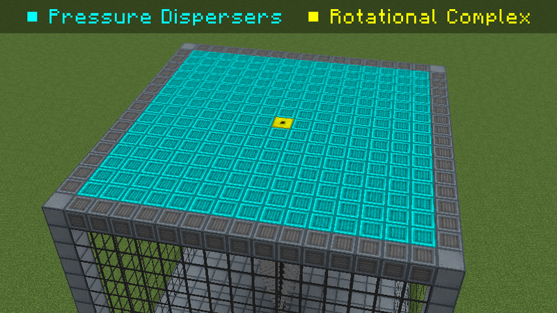 Cross-section of a turbine showcasing a flat, horizontal plane of pressure dispersers around the rotational complex.